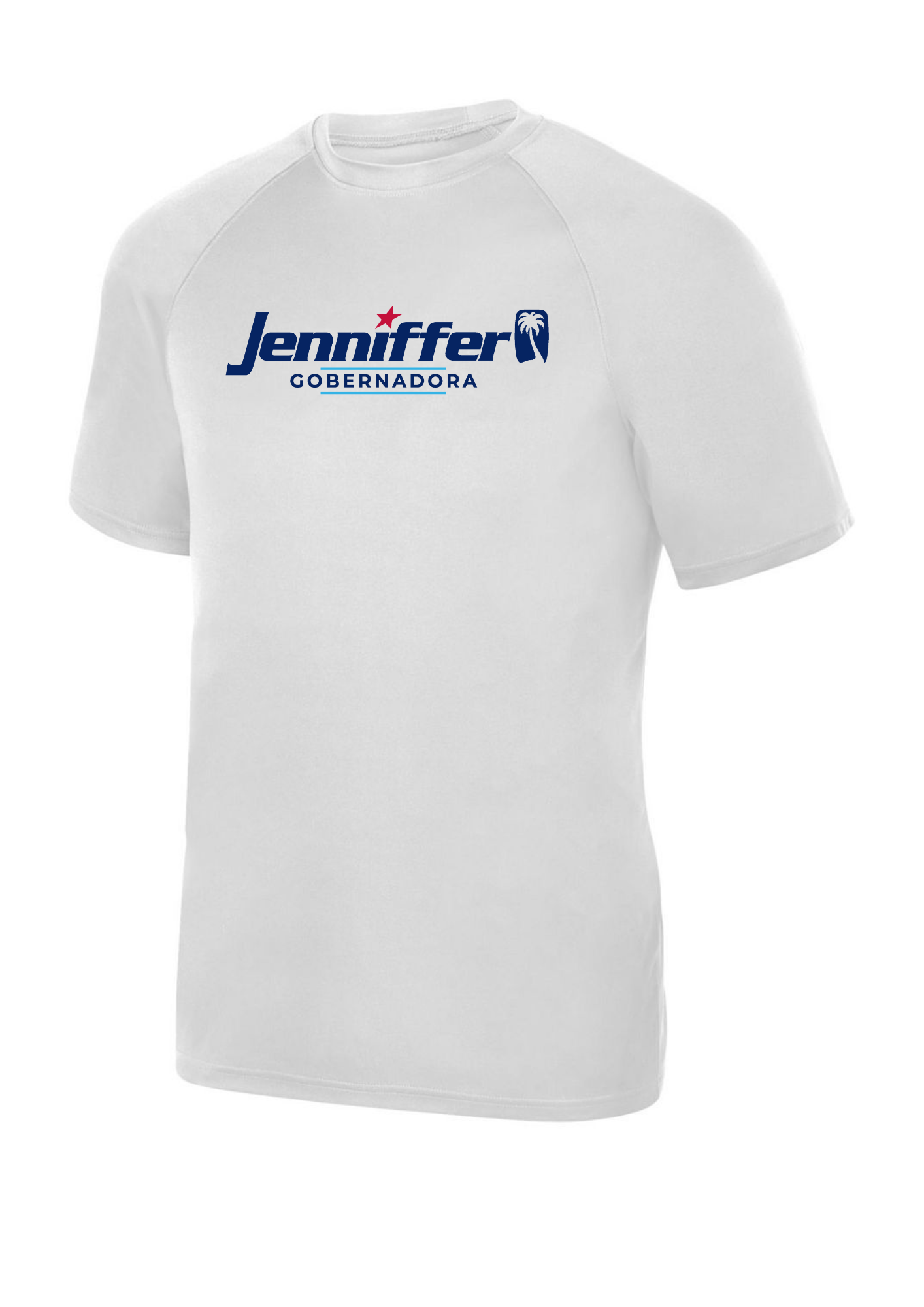 Camisa para caballeros de cuello redondo. Mangas estilo raglan. Microfibra de ajuste seco. Camisa de alto rendimiento confeccionada con tejido de punto absorbente 100 % poliéster. Cuenta con tecnología color Secure® que evita la migración del tinte, lo que garantiza una intensidad del color duradera. Esta camiseta Dry Fit presenta nuestro logotipo JENNIFFER GOBERNADORA en la parte delantera. Esta camiseta está diseñada para absorber la humedad, manteniéndote seco y cómodo durante actividades intensas.